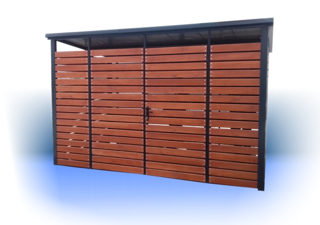 Wiata śmietnikowa 3,60 x 2,00 z poszycie z desek. Konstrukcja w całości z kształtowników zamkniętych malowanych proszkowo.
